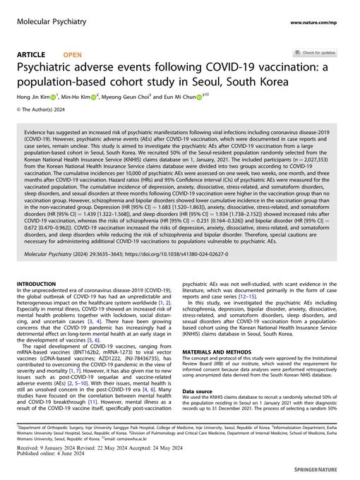 COVID-19 vaccination increased the risks of depression, anxiety, dissociative, stress-related, and somatoform disorders, and sleep disorders.