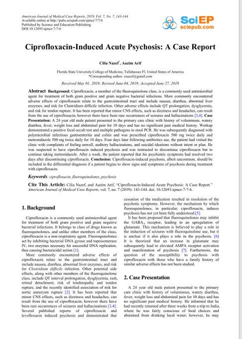 24 year old male developed auditory hallucinations, and suicidal ideations four days after taking antibiotic Ciprofloxacin.